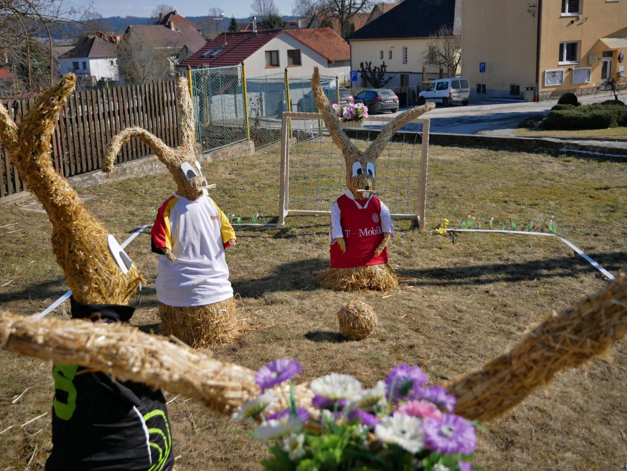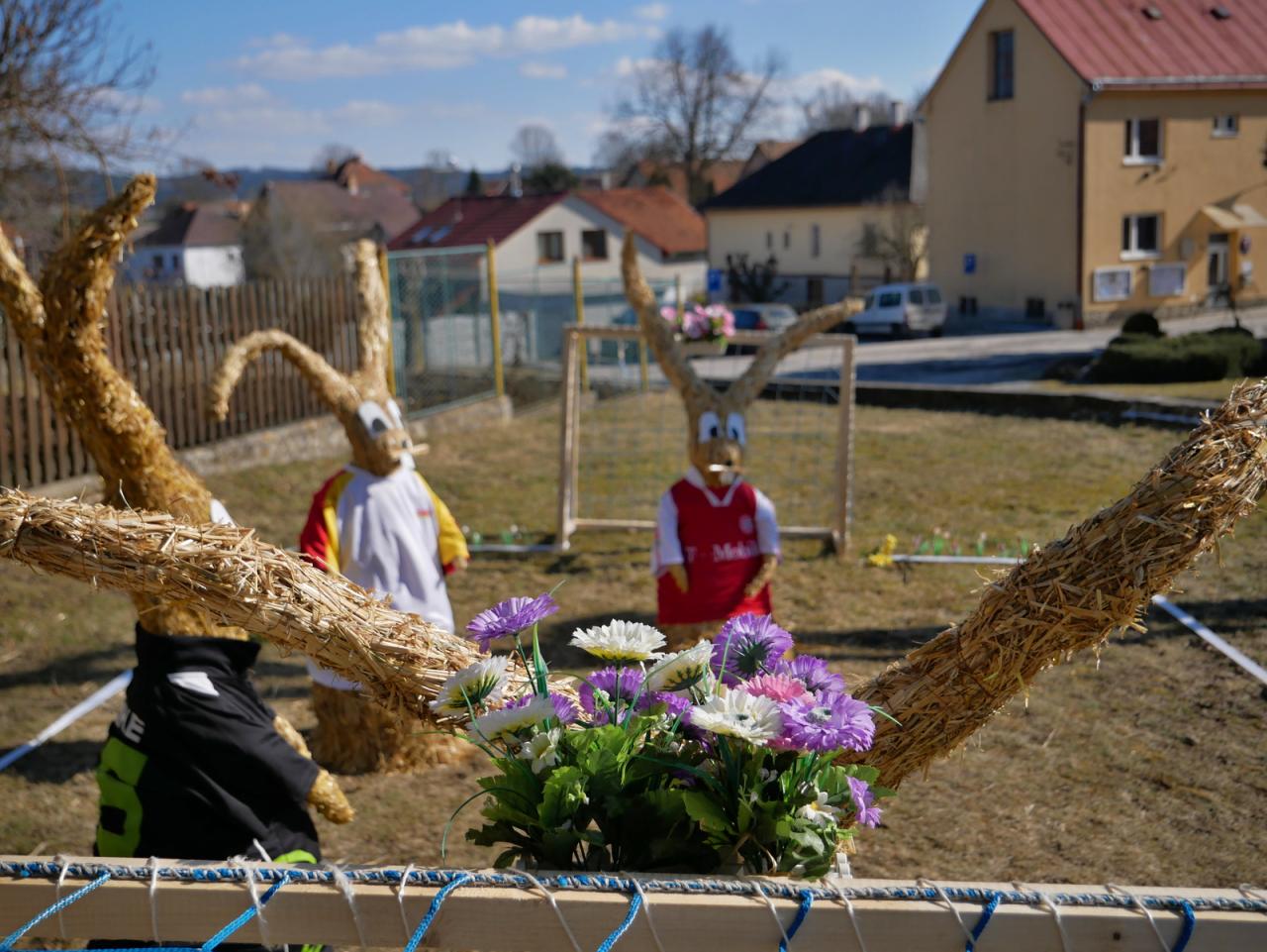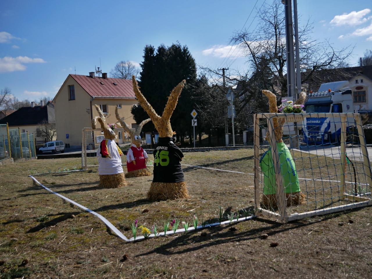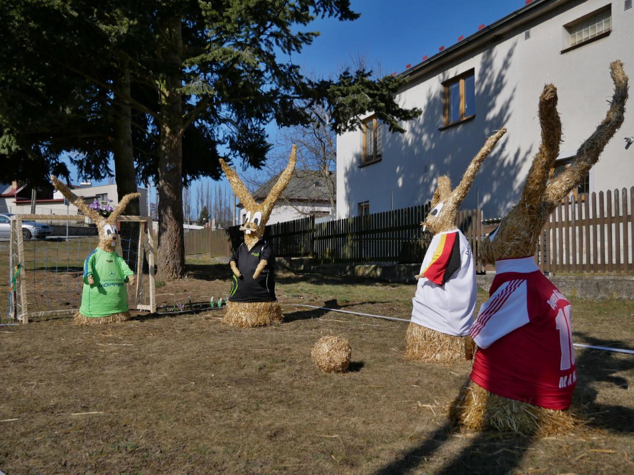 Po roce nás opět navštívili velikonoční zajíci. Na obecní návsi vesele hrají fotbal. Za jejich zhotovení děkujeme naší šikovné Míle Vyskočilové.