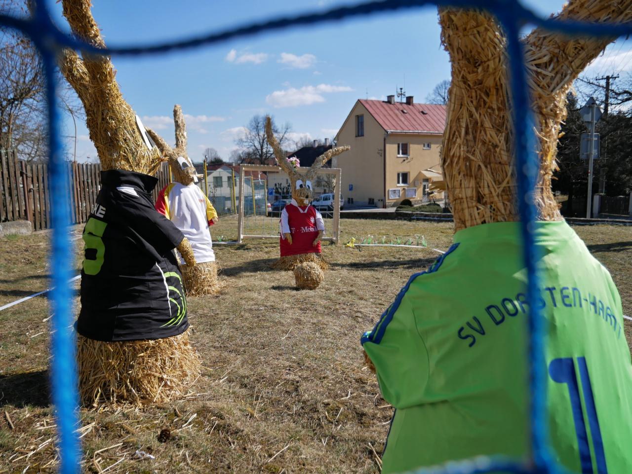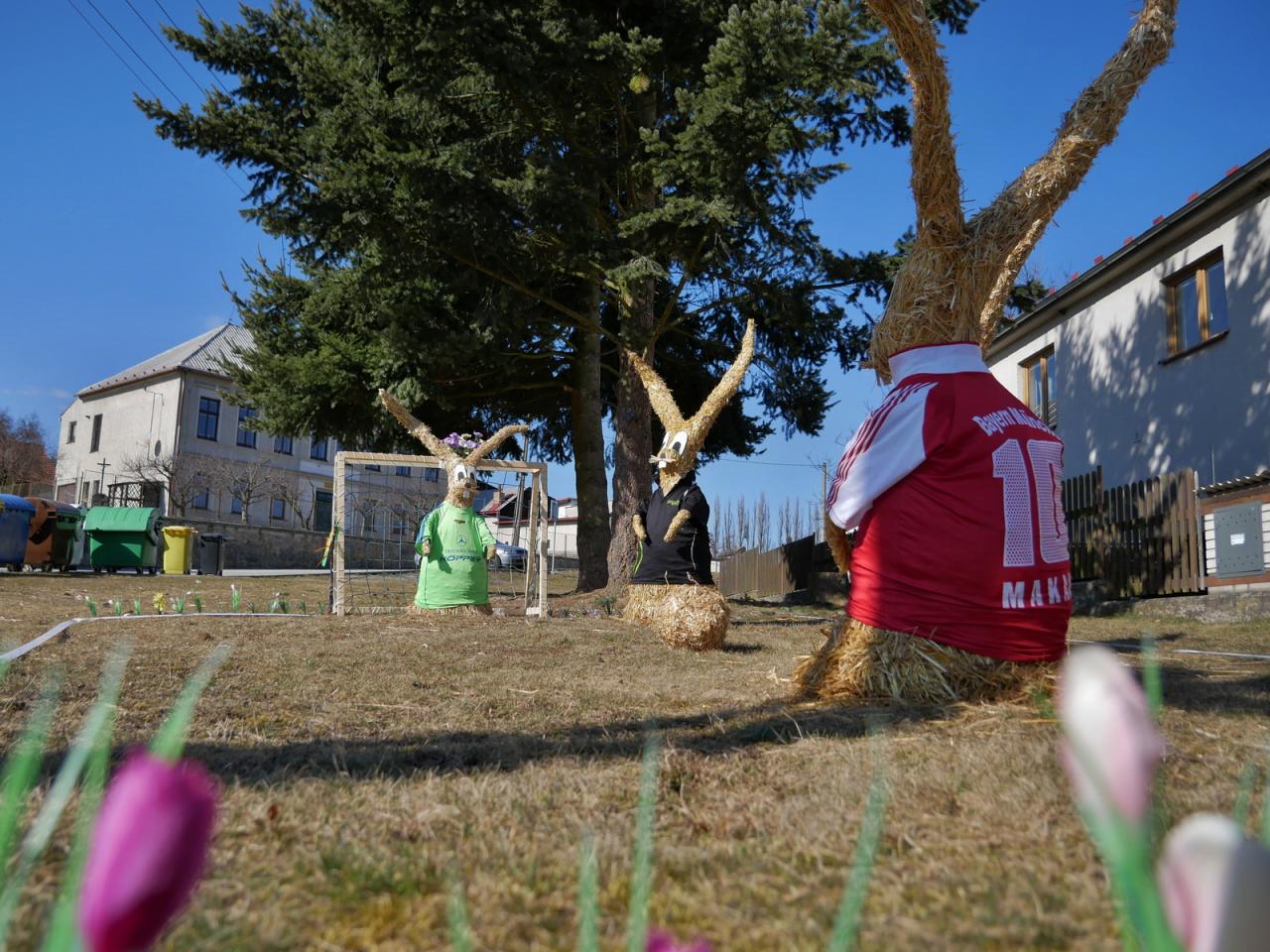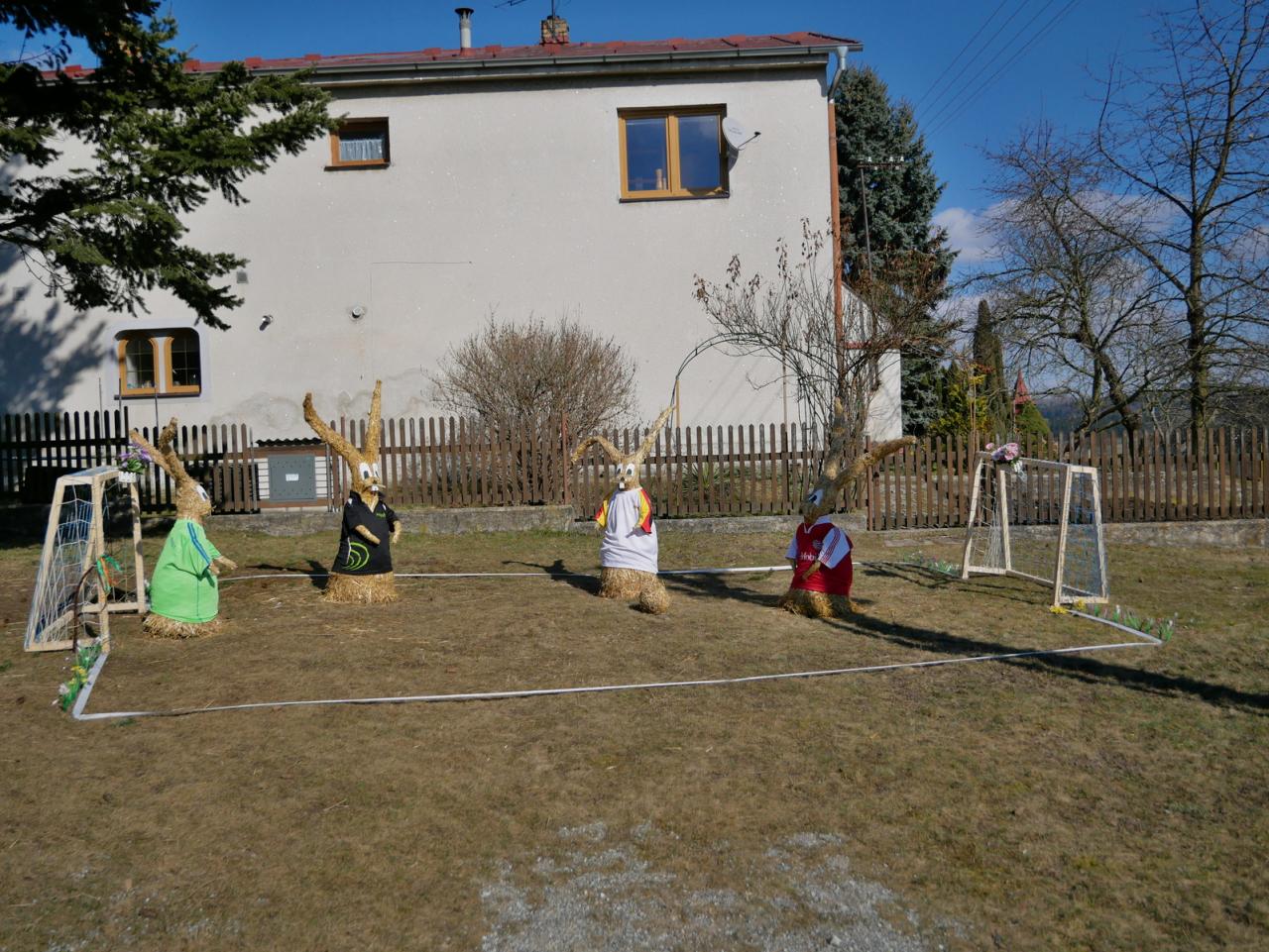 Po roce nás opět navštívili velikonoční zajíci. Na obecní návsi vesele hrají fotbal. Za jejich zhotovení děkujeme naší šikovné Míle Vyskočilové.