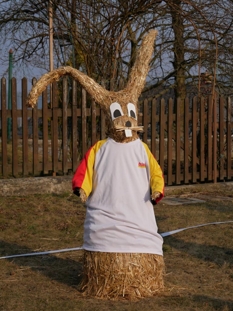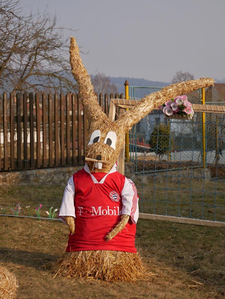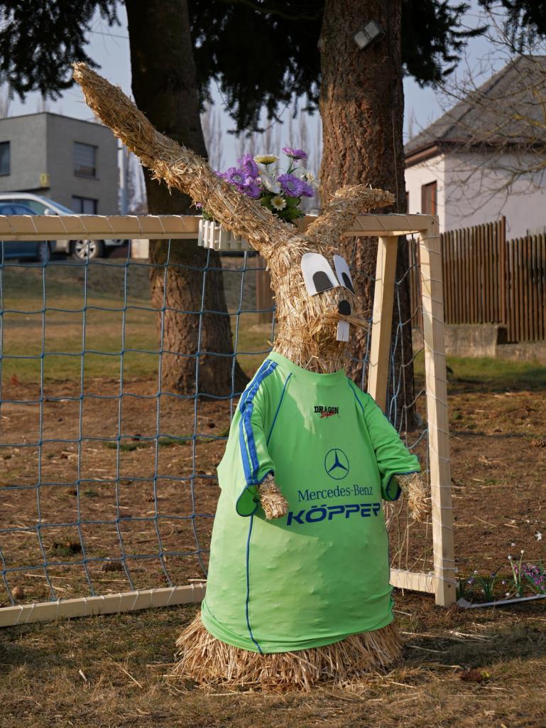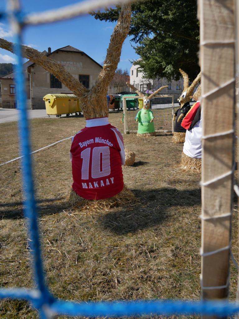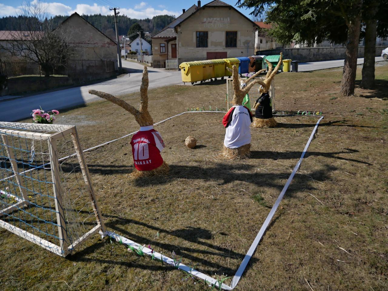 Po roce nás opět navštívili velikonoční zajíci. Na obecní návsi vesele hrají fotbal. Za jejich zhotovení děkujeme naší šikovné Míle Vyskočilové.